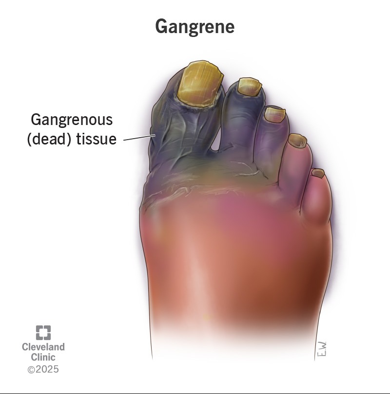 Gangrene presents with skin changes (pale to black/blue/red), swelling, blisters, foul odor, severe pain (or numbness), and coldness, progressing from early signs like a red border to tissue death. 'Before' involves risk factors (poor circulation, diabetes) and early symptoms; 'after' treatment (surgery, antibiotics, debridement, sometimes amputation, oxygen therapy) aims to stop the spread, save the limb/life, and involves healing, potential reconstruction, or amputation, with recovery depending heavily on early intervention.